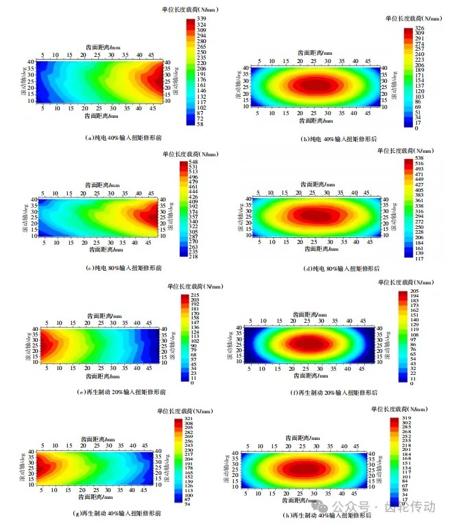 通過對齒輪微觀參數修形,傳遞誤差有所降低,純電30%~80%工況最為顯著,滾動角沿嚙合線的位移曲線更加平滑。減少齒輪嚙合時產生的沖擊和振動,進而降低齒輪噪聲,達到降噪目的。各工況接觸應力由齒輪一側轉移至齒面正中央,有效改善齒面偏載現象。最大接觸應力也有所降低。從修形結果可以看出,修形后齒輪嚙合更加平穩,振動減少、齒輪可靠性得到提高,NVH性能進一步提升。