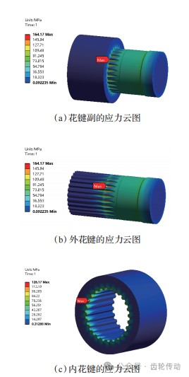 如上文所述,花鍵軸在完成結構設計后,由于解析法存在的種種假設,需要采用有限元法進行強度分析。由于花鍵副存在非線性接觸,需建立起花鍵副的實際模型進行分析,即在齒面上建立接觸對,以內花鍵作為目標面,外花鍵作為接觸面;摩擦系數設置為0.1;對內花鍵外端面全約束,對外花鍵的約束為徑向和軸向自由度,保留切向自由度;在端面上施加的扭矩載荷為2000N·m。花鍵副的應力云圖如圖2所示。其中,外花鍵最大應力為164MPa,發生在外花鍵靠近輸入端的齒根位置。內花鍵的最大應力為126MPa,發生在內花鍵的齒頂位置處。相比內花鍵,外花鍵受載更大,因此內、外花鍵中,僅校核外花鍵一處即可。
