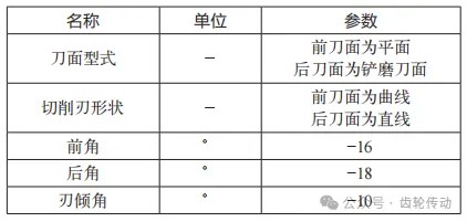 在弧齒錐齒輪硬齒面高速切削過程中,主要采用數控機床進行加工,機床加工中刀具是關鍵的加工設備。關于刀具,無論是刀具材料還是幾何參數都很重要,考慮到本次試驗采用的是淬硬鋼弧齒錐齒輪,本文選擇了粉末冶金高速鋼刀具。粉末冶金高速鋼具有高純凈度、高強度和高硬度的特性,其在實際應用中具有耐磨性好、能夠制造復雜刀具、節約材料和成本、可加工性好、高效率、長壽命及環保等優勢。因此,在制造業中,特別是對于需要高精度、高強度和高耐磨性的刀具制造領域,粉末冶金高速鋼是一種非常理想的材料。本次弧齒錐齒輪硬齒面高速切削試驗選擇粉末冶金高速鋼刀具作為主要切削設備,其具體的設計參數如表2所示。