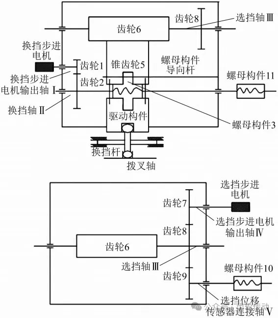 工作原理:選擋步進電機啟動旋轉,帶動與其相連的齒輪7轉動,通過與齒輪8的嚙合,使選擋軸轉動。選擋軸上的齒輪6與錐齒輪相互嚙合,使錐齒輪旋轉。錐齒輪的下部通過螺釘與驅動構件相連,驅動構件轉動,帶動換擋桿旋轉。最終,換擋桿下端的球頭沿垂直于紙面方向移動至相應的撥塊槽中,完成選擋操作。在選擇擋位的同時,通過齒輪7、8、9的嚙合使選擋位移傳感器連接軸轉動,帶動螺母構件10移動。螺母構件10上的傳感器將位移信號轉換為電信號,并傳遞給控制器。擋位選擇完成后,控制器根據來自選擋位移傳感器的信號,分析并發出換擋控制信號至換擋步進電機。換擋步進電機啟動旋轉,通過換擋步進電機輸出軸帶動齒輪1轉動。齒輪1與齒輪2嚙合,齒輪2旋轉,帶動換擋軸旋轉。換擋軸旋轉,通過螺旋副推動螺母構件3移動。螺母構件3的上部開有槽,與螺母構件導向桿構成移動副,由此螺母構件3僅能沿軸向移動。螺母構件3的中間有凸緣,嵌入驅動構件和錐齒輪的槽中,從而推動驅動構件移動,使換擋桿沿軸向移動。換擋桿上的球頭撥動撥塊,進而帶動撥叉軸沿軸向移動,最終完成擋位更換。螺母構件3、10、11均為帶梯形內螺紋的螺母構件。