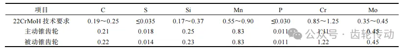 化學(xué)成分分析:切取失效件齒輪輪齒樣塊,采用直讀式光譜儀對失效的主被動螺旋錐齒輪取樣進(jìn)行化學(xué)成分分析,檢測結(jié)果滿足標(biāo)準(zhǔn)《保證淬透性結(jié)構(gòu)鋼》(GB/T 5216-2014)中對22CrMoH的成分要求, 如表1所示。