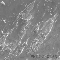 微觀形貌分析:對被動錐齒輪倒車面嚙合下沿,即打齒裂源處進(jìn)行掃描電鏡微觀分析,發(fā)現(xiàn)倒車面齒面因瞬時高溫焊合后撕裂形成凹坑、條紋,局部區(qū)域出現(xiàn)塑性流動痕跡。
