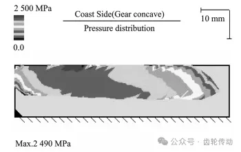 匹配電車以后,加載嚙合印跡已不能按照傳統(tǒng)燃油車倒車加載嚙合印跡做到60%停止,而應(yīng)進(jìn)行至100%,根據(jù)Kimos計算結(jié)果,在倒車面100%的情況下,嚙合印跡從小端脫出,最大接觸應(yīng)力達(dá)到2490MPa。