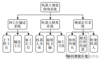 本系統(tǒng)的總體系統(tǒng)組成可以分為四工位環(huán)形輸送系統(tǒng),機(jī)器人倒角系統(tǒng)和視覺定位系統(tǒng),如圖4所示。