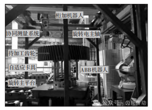 其中相機(jī),鏡頭和激光位移傳感器組成協(xié)同測(cè)量系統(tǒng),協(xié)同測(cè)量系統(tǒng)固定在桁架機(jī)器人上,可以對(duì)待加工齒輪進(jìn)行XYZ三個(gè)方向的立體測(cè)量,加工工位現(xiàn)場(chǎng)裝配圖,如圖5所示。