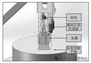 協(xié)同測(cè)量系統(tǒng)的組成和工作原理:為了滿足對(duì)大尺寸,多型號(hào)的齒輪輪廓進(jìn)行測(cè)量,采用一種協(xié)同測(cè)量的方法進(jìn)行測(cè)量,協(xié)同測(cè)量系統(tǒng)由相機(jī),激光位移傳感器和光源組成,如圖7所示。