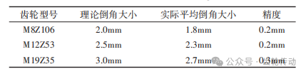 齒輪倒角加工效果分析:驗(yàn)證齒輪倒角加工效果是通過取3種不同型號(hào)齒輪進(jìn)行加工,每種齒輪型號(hào)選定20組進(jìn)行加工,將理論倒角大小和實(shí)際平均倒角大小進(jìn)行對(duì)比驗(yàn)證,獲得數(shù)據(jù),如表4所示。