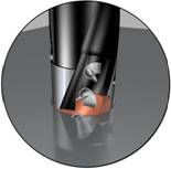 圖3 在可換頭鉆頭的鉆體與刀頭之間有安全的全新接口(專利申請中)。這提高了刀頭更換時的簡單性和安全性,并使刀頭可以精確地定位并獲得很好的支撐。刀頭只能以一種方式固定到鉆頭上,并用側面的螺釘鎖定住。沒有可能松動的部件,鎖緊是牢固的。對中是通過刀頭的導向銷和刀頭座內半圓柱接觸表面之間的接觸實現的。