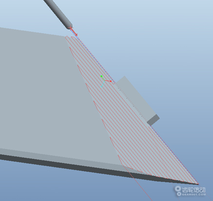 在斜面加工時,若采用圖3.1所示的橫向水平走刀,每一段走刀距離都很短,在切削過程中主軸需要頻繁換向,切削穩定性差。且由于切削的是斜面,水平走刀需要X或Y軸與Z軸的聯動,不利于切削速度的提升。因此,針對此類斜面加工,走刀軌跡盡量安排為平行于最長斜邊(如圖3.2),不但走刀軌跡最長、換向次數最少,而且單道走刀都只是在XY平面運動切削,Z軸方向運動都是安排在工件輪廓之外的位置,即使在高速切削下亦可減小刀具損傷。