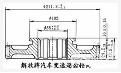(2)汽車齒輪。右圖是解放牌汽車的變速箱中的齒輪,其任務是將發動機的動力傳遞到后輪,承受重載和大的沖擊力,工作條件比機床齒輪復雜,要求齒面具有高的硬度(60~62HRC)和耐磨性、齒心部具有高的強度和優良的韌性,考慮到滲碳工藝性的要求和淬透性的問題,可選用20CrMnTi鋼。其工藝路線為:下料→鍛造→正火→粗加工、半精加工→滲碳→淬火+低溫回火→噴丸→校正花鍵孔→精磨齒。