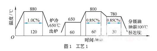 工藝1曲線如圖1所示,使用設(shè)備是天龍生產(chǎn)的多用爐,型號為RM9-75/130/75-5-TL。淬火冷卻介質(zhì)使用北京華立精細(xì)化工公司今禹等溫分級淬火油,型號Y35-Ⅱ。