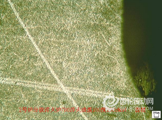 經(jīng)過此次生產(chǎn),我們認(rèn)為小模數(shù)滲碳淬火產(chǎn)品,淬火溫度的控制應(yīng)謹(jǐn)慎,不能一味的為滿足心部硬度而降低淬火溫度,一定要考慮小模數(shù)產(chǎn)品出爐過程中由于結(jié)構(gòu)的原因溫降過快對心部硬度和組織的影響。