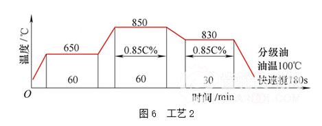工藝1曲線如圖6所示,使用設(shè)備為天龍生產(chǎn)的多用爐,型號:RM9-75/130/75-5-TL。淬火油使用的是北京華立精細(xì)化工公司今禹等溫分級淬火油,型號Y35-Ⅱ。
