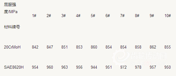 變速器齒輪可采用SAE8620H材料代替20CrMoH來提高齒輪根部的彎曲疲勞強(qiáng)度,表1為SAE8620H與20CrMoH材料主要化學(xué)成分的區(qū)別。SAE8620H材料Ni元素含量增加了約0.50%,Cr元素含量減少約0.50%,即用0.50%的Ni元素代替0.50%的Cr元素。Ni元素能中等強(qiáng)化鐵素體,增加Ni元素能很好地提高心部鐵素體組織的強(qiáng)度。分別抽取不同爐號(hào)的10個(gè)試樣,進(jìn)行力學(xué)性能試驗(yàn),見表2,SAE8620H試樣屈服強(qiáng)度明顯高于20CrMoH試樣10%以上,有利于齒輪根部彎曲疲勞強(qiáng)度的提升。