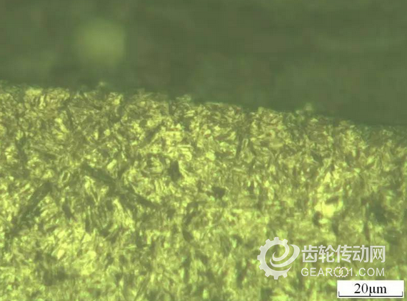 高能等離子噴涂工藝致使表層約20μm深度區(qū)域化學(xué)成分及顯微組織發(fā)生改變,從20μm~0.15mm處依然是噴丸強(qiáng)化層。高能等離子噴涂,采用Mo等合金元素組成的復(fù)合材料,鉬能使鋼的晶粒細(xì)化,提高力學(xué)性能。在高溫高壓的條件下撞擊并滲透進(jìn)母材的20μm以內(nèi)深度表面,使金屬表面20μm以內(nèi)深度的晶相組織發(fā)生改變(見圖1、圖2),圖2表面波紋度很小,幾乎沒有晶界氧化,疲勞微裂紋就不易從表面發(fā)生,有利于齒面疲勞強(qiáng)度的提高。