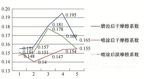 在加工過程中加入固體潤(rùn)滑劑,固體潤(rùn)滑劑滲入金屬表面后,使表面具有自潤(rùn)滑的效果,摩擦阻力減少。經(jīng)過摩擦試驗(yàn)測(cè)試(見圖3),干摩擦因數(shù)下降12.1%,濕摩擦因數(shù)下降7.8%,齒輪副在嚙合過程中,齒面運(yùn)轉(zhuǎn)狀況得到進(jìn)一步改善。