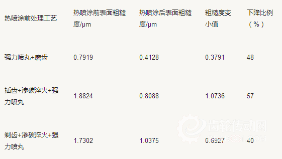 經(jīng)過高能等離子噴涂后,齒形輪廓偏差、螺旋線輪廓偏差值下降4~6μm;對(duì)于0.8~1.6μm的磨、剃齒面,齒面粗糙度改善約50%(見表5)。高能等離子噴涂能很好地彌補(bǔ)噴丸強(qiáng)化給齒面帶來的損傷,優(yōu)化齒輪表面質(zhì)量,從而提升疲勞強(qiáng)度。