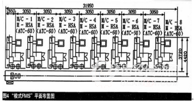 日本三菱重工為適應批量生產之急需采用這種高速加工中心為主機,開發了所謂“梭式FMS”(見圖4)。該FMS由8臺M-H5A三坐標加工中心和位于機床前方的載有2個托板的無人運載車(AGV)構成,運載車用于交換托板,往復于托板裝卸工位和各機床之間。操作者只須在一個位置通過操作按鈕進行工件裝卸就可以了,不必往返于機床之間。運載車依次行至即將完成加工的機床前面等待,待機床加工完之后在機床與運載車之間實現托板交換,然后載著加工完的成品返回裝卸工位。