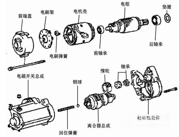 發動機起動后,及時放松點火開關,吸引、保持線圈斷電,活動鐵芯在回位彈簧力作用下回位,接觸盤與觸點分離,電機停止轉動。同時,驅動齒輪軸在其回位彈簧作用下回位,使驅動齒輪與飛輪分離,一切恢復到初始狀態。