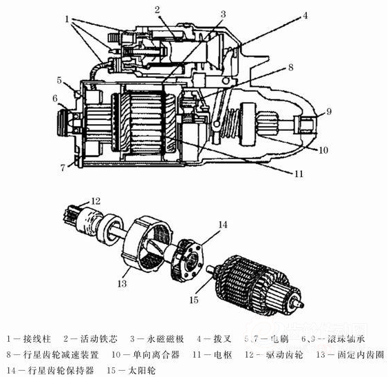 DW1.4型永磁減速起動機為博世公司生產,用于吉普車上,該起動機采用的是行星齒輪減速裝置,其結構如圖4-23所示。