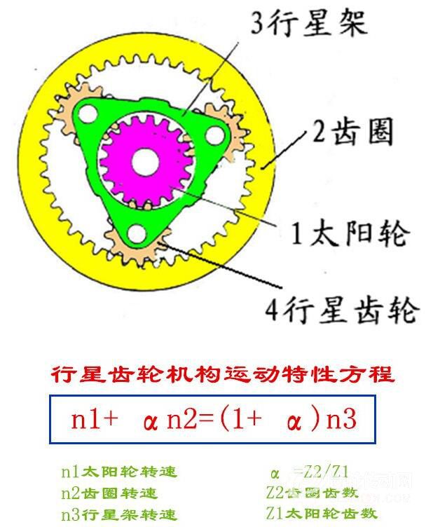 行星齒輪機構由太陽輪(中心輪)、行星齒輪、行星齒輪架(行星架)、齒圈等組成,為軸轉式齒輪系統,與定軸式齒輪系統一樣,也可以實現變速與變矩。它的運轉遵循一個行星齒輪機構運動特性方程: