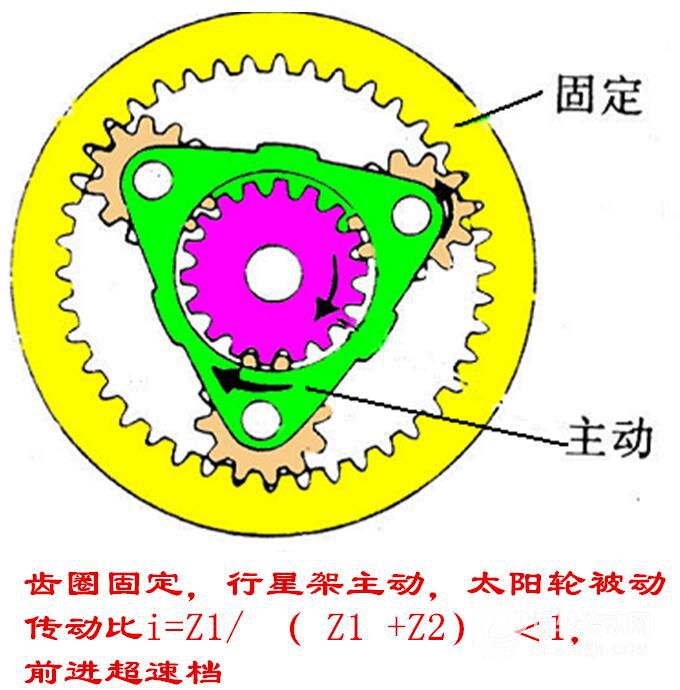 此種組合為升速傳動,傳動比一般為0.2~0.4,轉向相同,為前進超速檔。