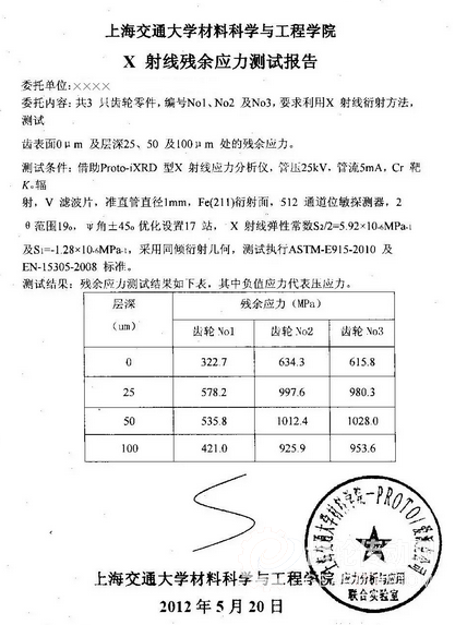 將某單位在拋丸清理機上強化的三個件號為(9274893)齒輪,送上海交通大學材料科學與工程學院做X射線殘余壓應力檢測。附測試報告于后: