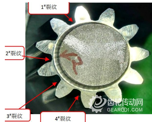 裂紋在齒輪軸端面的分布位置如圖4所示。齒輪軸有4個齒根分別存在1條裂紋,編號分別為1#~4#裂紋。