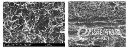2#、3#裂紋斷口形貌相同。裂紋斷口宏觀較平整、未見明顯塑性變形,源區位于齒根端角(齒根與橫截面相交的端角)表面、小線源特征;齒根與橫截面相交的端角不夠圓滑,且加工面較粗糙,形貌如圖7、圖8所示。裂紋擴展區主要為沿晶形貌,局部為韌窩形貌,如圖9、圖10所示;人為打斷區為韌窩形貌,如圖11所示。