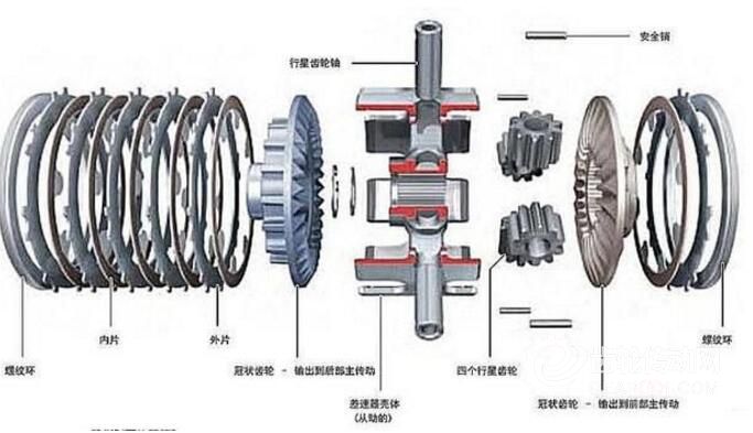 冠狀齒輪的旋轉同時會帶動多片式離合器內片轉動,內片通過摩擦帶動外片轉動,外片則帶動整個差速器轉動。