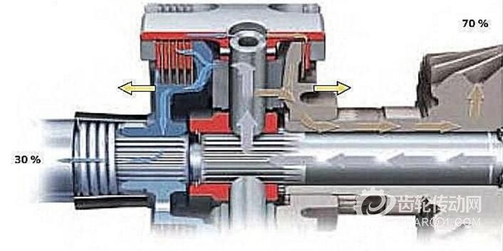 當后軸車輪附著力降低時,冠狀齒輪差速器會將最多70%的扭矩傳遞至前軸。