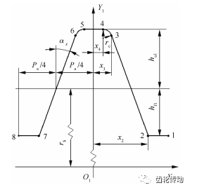圖 1 所示為阿基米德滾刀基本蝸桿軸向齒形。O1 -X1Y1 為滾刀坐標系,其 X1 軸與滾刀軸線重合,Y1 軸平分軸向齒形。軸向齒形齒頂高 ha1 = 1. 35 mn ,齒根高 hf1 =mn,mn 為滾刀的法向模數。