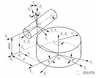 圖 2 中,O1 -X1Y1Z1 為滾刀坐標系,其與滾刀固連,在加工過程中繞 X2 軸回轉,O2 -X2Y2Z2 為滾刀安裝坐標系,其相對于滾刀參考坐標系 O3 -X3Y3Z3 繞 Y3 軸旋轉一個滾刀安裝角 γi;O4 -X4Y4Z4 為工件參考坐標系,其與滾刀參考坐標系 O3 -X3Y3Z3 相互平行,O5 - X5Y5Z5 為工件坐標系與被加工齒輪固連,在滾齒過程中按一定傳動比隨滾刀聯動繞Z4軸回轉。O6 - X6Y6Z6 為機床固定坐標系,滾刀的徑向進給、軸向進給均在該坐標系里描述坐標。