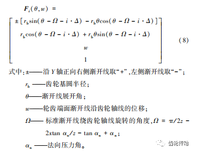 漸開線直齒輪齒槽面可由其端面上漸開線沿齒輪軸線平移形成,形成齒槽面的端面漸開線可由起點在 Y 軸(Y 軸平分齒槽)上的兩條標準漸開線繞齒輪軸線向相反方向旋轉一角度獲得。齒輪各個齒槽的幾何形狀相同并在圓周上均勻分布,相鄰齒槽的相位差角為 Δ = 2π / z,用 0,…,i,…,z-1( z 為齒數) 對各齒槽編號,則各齒槽面的齊次坐標方程為: