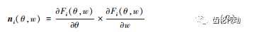 將理論齒面 Fi(θ,w) 的參數 θ 和 w 在其取值的范圍內進行離散,形成網格密度為 m × n 的理論齒面網格點,其中的某一點可以計為 Fi(θm,wn ),其對應的法向量計為 ni(θm,wn )。圖 4 所示為齒面誤差計算示意圖。