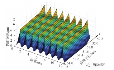 圖 7 中 X 軸為齒寬方向,Y 軸為齒廓方向,Z 軸顯示的為齒面誤差值,其反映理論加工齒面與標準齒面之間的法向偏差。由圖 7 可見,齒向誤差沿著齒寬方向呈波浪形變化,由于滾齒切削時滾刀軸向進給取值較大,產生的齒向誤差值也大。另外,齒面齒形誤差沿輪齒齒廓方向靠近齒頂處明顯增大。