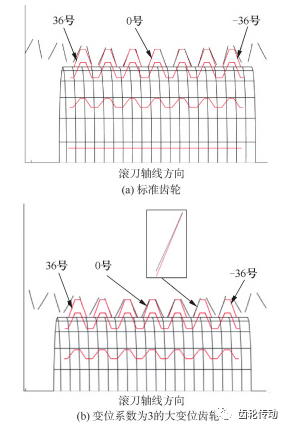 由圖 8a 可知,標準齒輪加工時滾刀 0 號切削刃幾乎與齒槽輪廓重合(齒數較多漸開線齒廓幾乎為直線),齒槽最終輪廓由 0 號及其附近較少滾刀切削刃滾切出來。由圖 8b 可知,大變位齒輪加工時齒槽正中央的 0 號切削刃對最終齒槽輪廓起不到切削作用。圖中齒槽左側面由右邊刀刃號為負的切削刃滾切出來,右側齒面由左邊切削刃加工出來。滾刀有效切削刃較少會在靠齒頂處存在切削不足,如圖中局部放大視圖所示,距中間較遠的 36,-36 號切削刃在齒頂處也產生較大切削誤差。