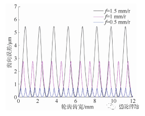 圖 10 所示為軸向進給量 f 為 1. 5,1,0. 5 mm / r 時齒向誤差仿真結果。由圖 10 可知,在不同軸向進給量下齒向誤差值變化明顯,軸向進給量為 1. 5 mm / r 時,誤差最大值為 5. 4 μm 左右;軸向進給量為 0. 5 mm / r 時,誤差最大值為 0. 6 μm 左右。齒向誤差最大值隨滾刀軸向進給量的減小大幅度減小。
