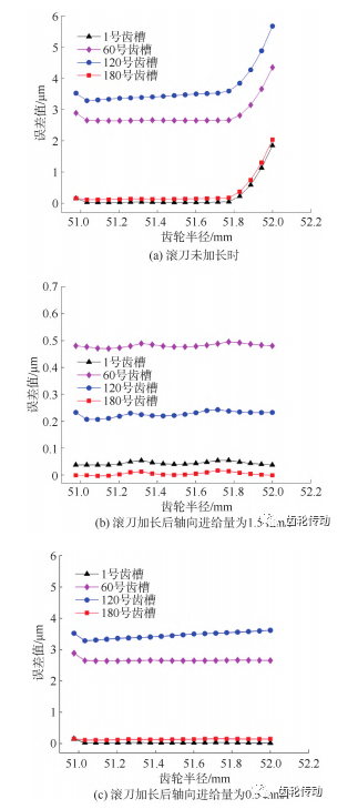 由圖 12a 和圖 13a 可看出,滾刀未加長時各齒槽左、右齒面齒形誤差靠近輪齒齒頂處均明顯增大。