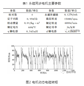 模型仿真:本文利用MATLAB/Simulink軟件搭建電機矢量控制模型,由于該軟件提供了很多功能模塊,使得搭建永磁同步電機動態仿真模型變得更容易。永磁同步電機主要參數見表1。電機負載轉矩根據公式(4)計算得到,采用 UDDS工況,仿真得到如圖2所示的電機動態電磁轉矩。