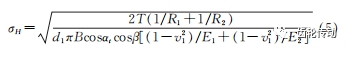 式中:T表示主動輪轉矩;B 表示齒寬;d表示主動輪分度圓直徑;αt 表示法向壓力角;β表示螺旋角;E1、E2 表示彈性模量;v1、v2 為泊松比;曲率半徑R1、R2 根據下式計算:
