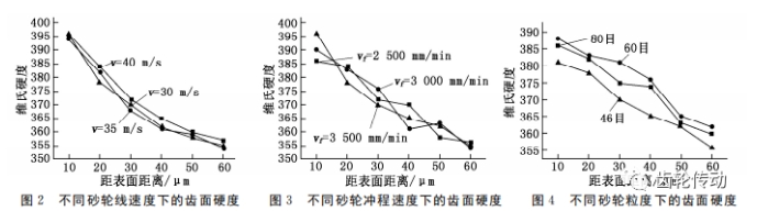 由圖 2~ 圖 4 可以看出:齒面硬度在 HV354~ HV398范圍內(nèi)變化,并且隨著與表面距離的變大而減小,與砂輪線速度v、砂輪沖程速度vf、砂輪粒度并無明顯的變化相關(guān)規(guī)律。這是由于磨削加工會使零件表面發(fā)生塑性應變,產(chǎn)生加工硬化現(xiàn)象,從試驗結(jié)果中可以看出硬化層深度大概在50μm~55μm 左右,硬化層的硬度大于基體的硬度,硬化程度約為11%左右。硬度測試結(jié)果也未發(fā)現(xiàn)有硬度異常的點,說明該次試驗齒面磨削沒有出現(xiàn)磨削燒傷而導致硬度降低的情況。