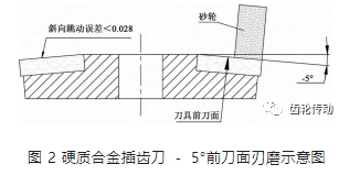 硬齒面內齒圈刮削過程中,刀具刃口逐漸磨損不再鋒利,須對插齒刀 - 5°前刀面進行刃磨(見圖 2),刀具刃磨后能否保證刀具固有的參數和精度,尤其是前刀面斜向跳動誤差是否合格,對加工零件的齒形精度有至關重要的影響。