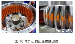 通過齒面涂抹紅丹粉,檢查內外齒嚙合接觸情況,齒面接觸印跡達到設計要求(如圖 10) 。