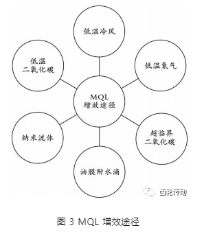 MQL 技術使用的磨削液量少,磨削力小,有利于刀具的保養,且能夠有效地提高工件的質量。但是,在特定的工作條件下,MQL 降低磨削區溫度的能力不足,且潤滑能力也不盡如人意。國內外研究人員對 MQL 增效技術進行了研究。現有的增效途徑包括采用低溫冷風、低溫氮氣、低溫二氧化碳、納米流體、油膜附水滴和超臨界二氧化碳。MQL 增效途徑如圖 3 所示。