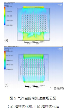 2) 根據模擬仿真結果對氣淬室進行結構優化,在進風口處增加導流板,并且在工裝上安裝相應的風道。中心區域的氣體來流速度較優化前提高 24% 左右。