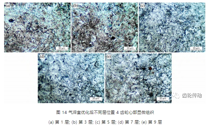 采用與最初氣淬試驗相同的試驗條件與工藝曲線,試驗件擺放位置也與初次試驗相同。如圖 13 所示,結構改造后試驗齒輪心部硬度均在 400 HV10 以上,符合心部硬度大于 380 HV10 的指標。對第 1、3、5、7、9 層的位置 4 齒輪進行制樣,使用 Zeiss Axio ScopeA1 金相顯微鏡觀測心部組織,如圖 14 所示,組織為貝氏體與馬氏體,沒有鐵素體出現,符合組織合格要求。