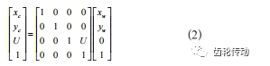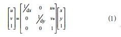 圖像坐標系與像素坐標系的關系為單位轉換和坐標平移的關系,設像素坐標系原點在像平面坐標系下的坐標為(u0,v0),每個像素點在圖像坐標系x軸、y軸方向的尺寸為dx和dy,且像點在像平面坐標系下的坐標為(x,y),于是可得到像點在像素坐標系下的坐標(u,v)的齊次坐標形式如式(1)所示:
