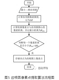 齒根圓像素點的提取過程如圖5所示,先計算齒頂圓的像素圓度,也即先評估齒頂圓上點相對于理想圓的徑向波動范圍,記為ΔR;齒根圓和齒頂圓同心,再計算齒廓上離圓心最近的點(該點必為齒根圓上點),記錄該點到圓心的距離為Rmin;齒根圓與齒頂圓應具有相當的圓度誤差,判斷每一個齒廓上的像素點到圓心的距離是否小于 (Rmin+ΔR),若小于該值則該像素點記為齒根圓上點。