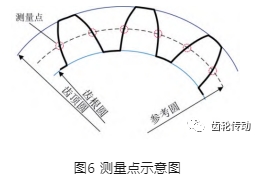 測量點提取:對于測量點的確定,根據齒輪幾何參數的定義本文先在齒輪外輪廓圖片上構造與齒輪基準軸線同心參考圓,參考圓與齒輪外輪廓的交點即為測量點。不同的被測參數具有不一樣的參考圓(詳見1.4.3節),測量點定義如圖6所示。利用圖3所示算法已經擬合得到的齒頂圓和齒根圓,參考圓與它們同心,直徑則是根據它們各自的定義得到,這樣很容易在軟件算法上實現各個參考圓的構建。
